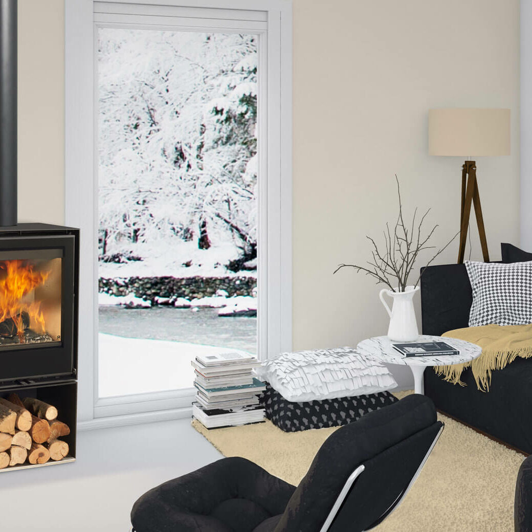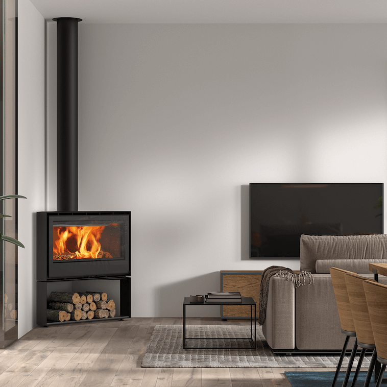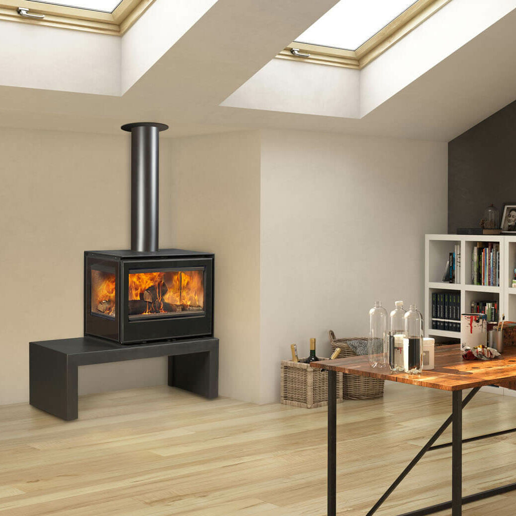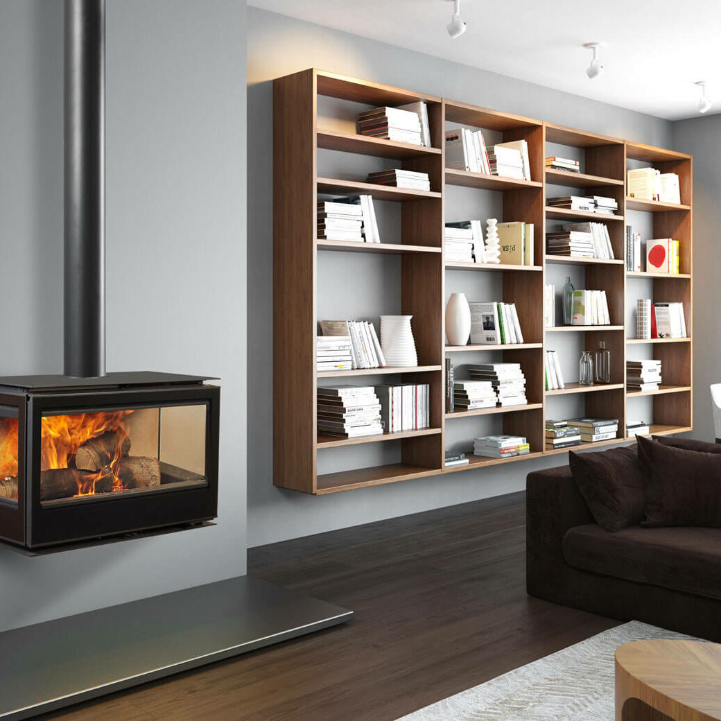 Dvoustranná průhledová krbová kamna, šíře 100 cm.